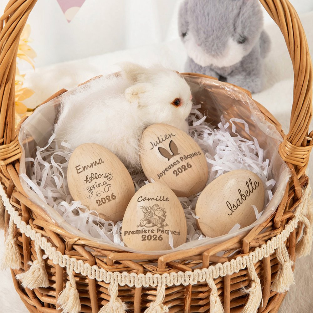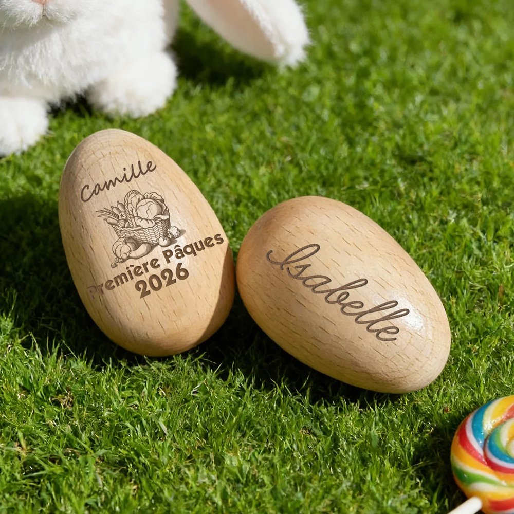 Ces œufs de Pâques en bois présentent une silhouette en forme d'œuf et de charmantes gravures sur le thème de Pâques. Choisissez parmi plusieurs motifs, puis personnalisez-les avec un nom, un texte personnalisé et l'année pour créer un souvenir unique. Remplis de sable, ils émettent un léger son lorsqu'on les secoue, ce qui en fait à la fois une jolie décoration et un hochet musical amusant.